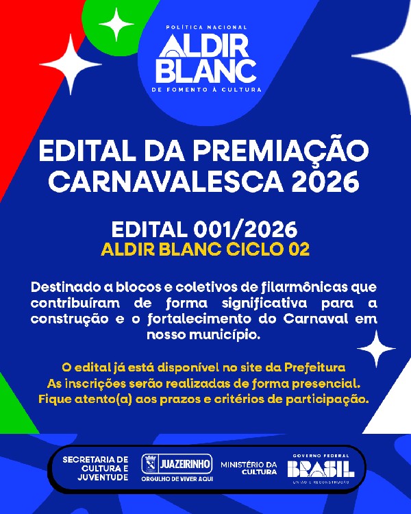 - PNAB (Ciclo 2), lança o Edital da Premiação Carnavalesca 2026, com o objetivo de reconhecer, valorizar e incentivar os fazedores de cultura que mantêm viva a tradição do nosso Carnaval.